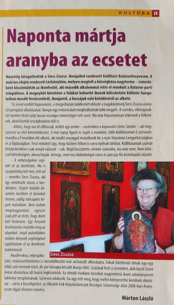 Napjainkban nem csak a stílus változatlan – a technika is. Siess Zsuzsa szintén fára festi alakjait – gondos, alapos előkészítés után. A Fonyódon élő alkotó – rajztanár édesapjának köszönhetően – gyermek- és ifjúkorát a művészetek vonzásában töltötte, s szinte törvényszerű – vagy fogalmazzunk inkább úgy, hogy sorsszerű – volt az önálló útkeresés. Két évtizede lakóhelyén, Fonyódon mutatkozott meg először a széles publikum előtt, majd sorozatban jöttek a felkérések egyéni és csoportos kiállításokra. A felismerés, hogy rabja és gyakorlója lett az ikonfestészetnek, számos tanulsággal és elismeréssel szolgált számára. Somogyország fontos művészeti díjainak birtokosa, de alkotótársai sem fukarkodnak az elismeréssel: Aranyecset, Kiváló művész címekkel buzdítják újabb csúcsok meghódítására. Siess Zsuzsa nem csak hívő, önzetlen lokálpatrióta is: erről tizenhat nagyméretű, ajándékba adott ikonja tanúskodik a fonyódi templomban.