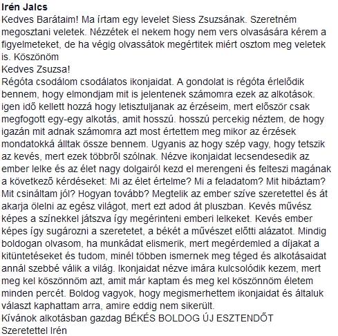 A művésznő hitvallása szerint tehát az ikon képbe foglalt imádság – egy fohász, amely ajtót nyit a láthatatlan világba. Siess Zsuzsa most új távlatokat nyitott számunkra – lépjünk be együtt, hogy megmártózzunk ebben a misztikus miliőben.